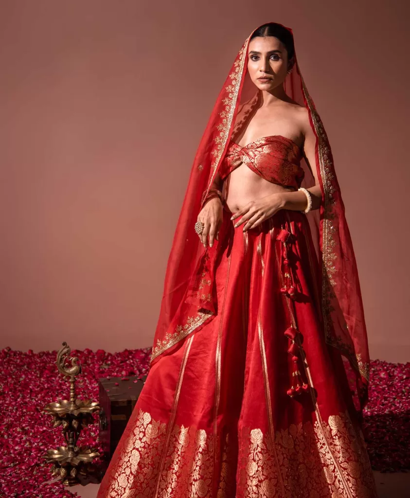 - Pure Banarasi silk bridal lehengas with traditional motifs